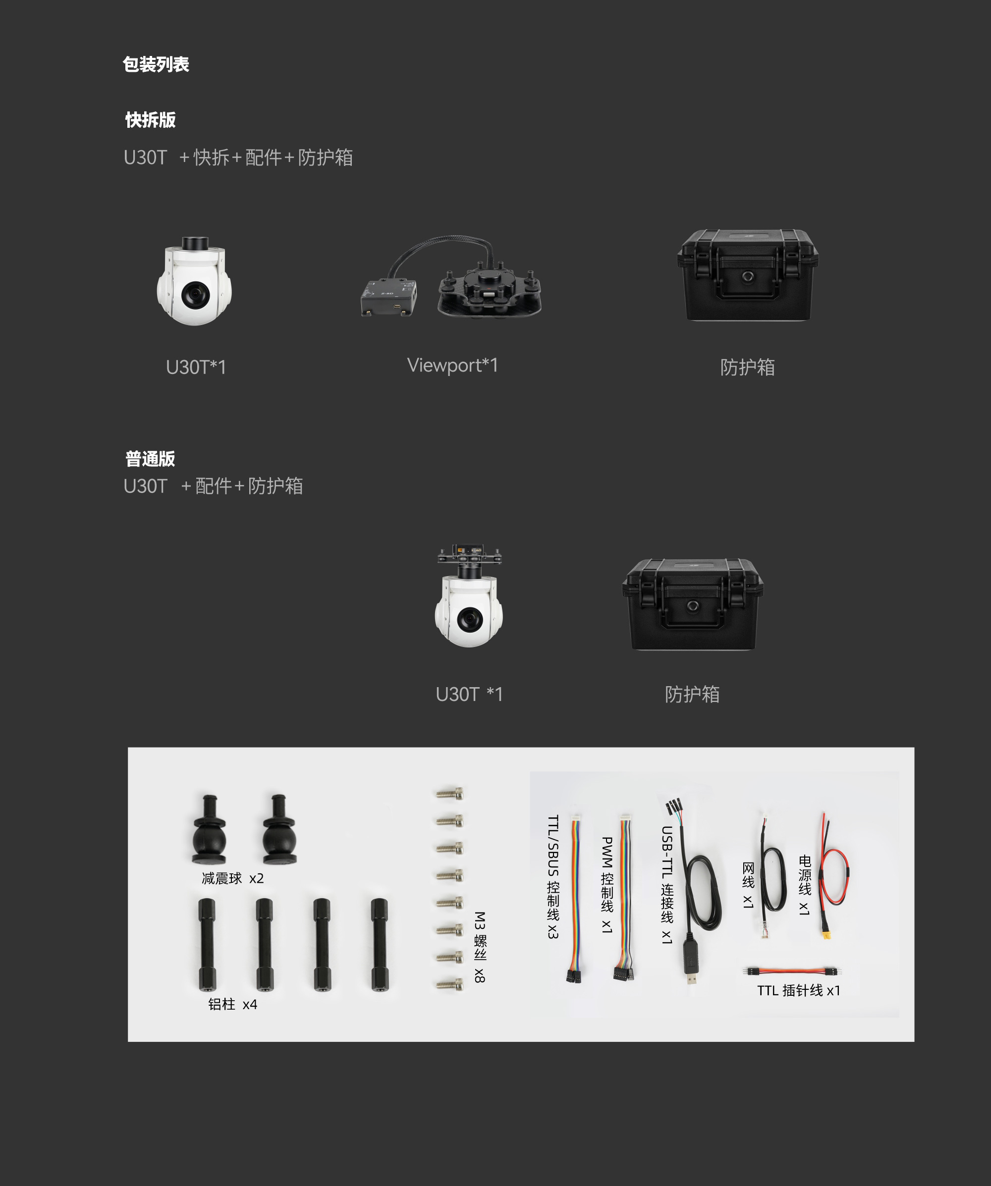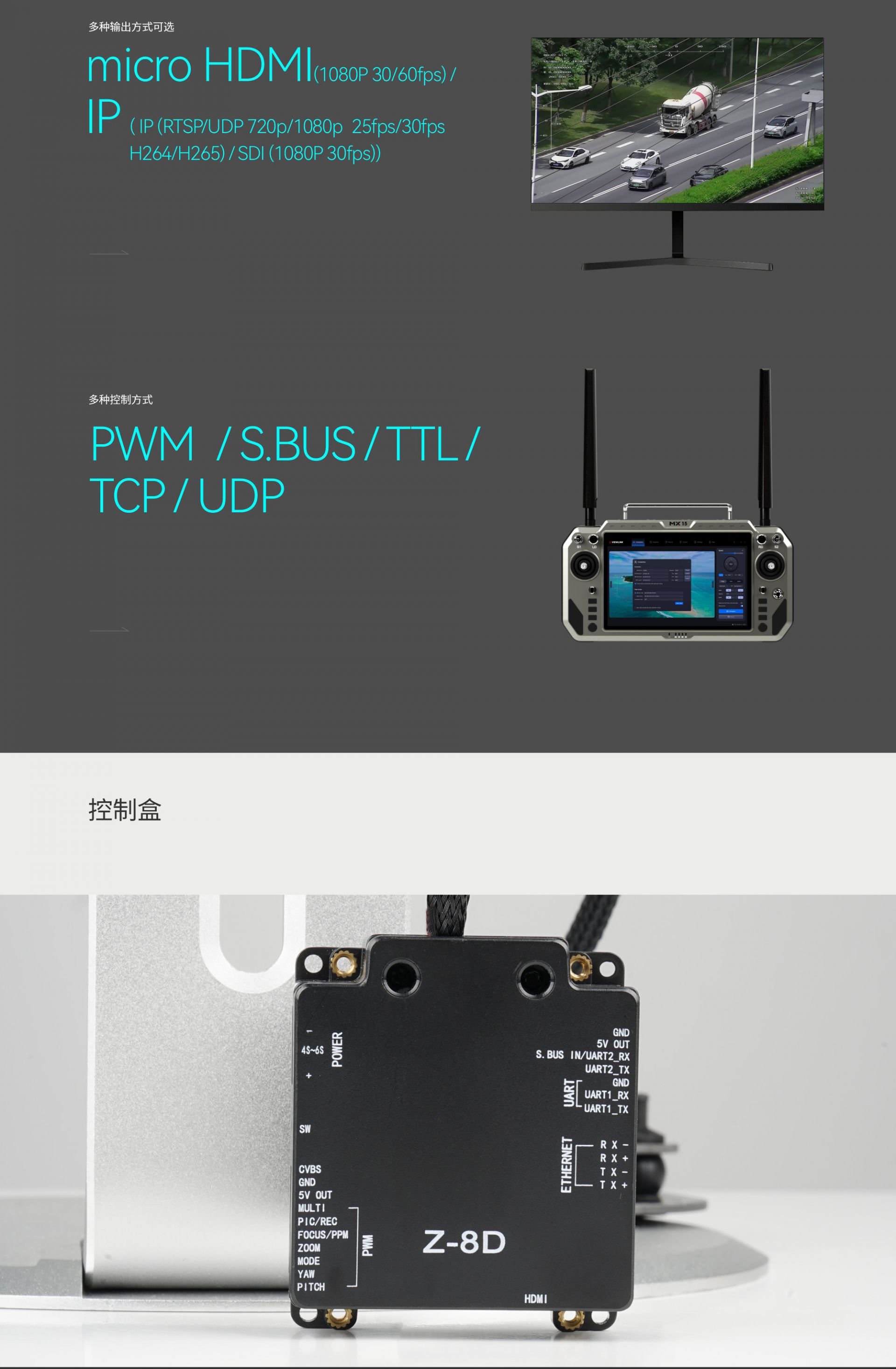 | 控制方式 | PWM / S.BUS / TTL / TCP / UDP |