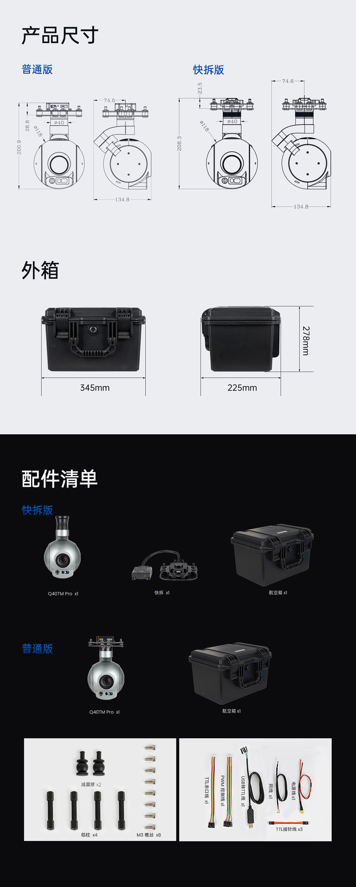 Q40TMpro是一个三轴高精度吊舱。它集成了一个40倍光学变焦相机,采用213万像素高分辨率长焦镜头,水平视场角为58°的广角镜头,3-2000m激光测距仪。支持光学变焦、拍摄和视频、目标跟踪、数字变焦、目标GPS位置解算。