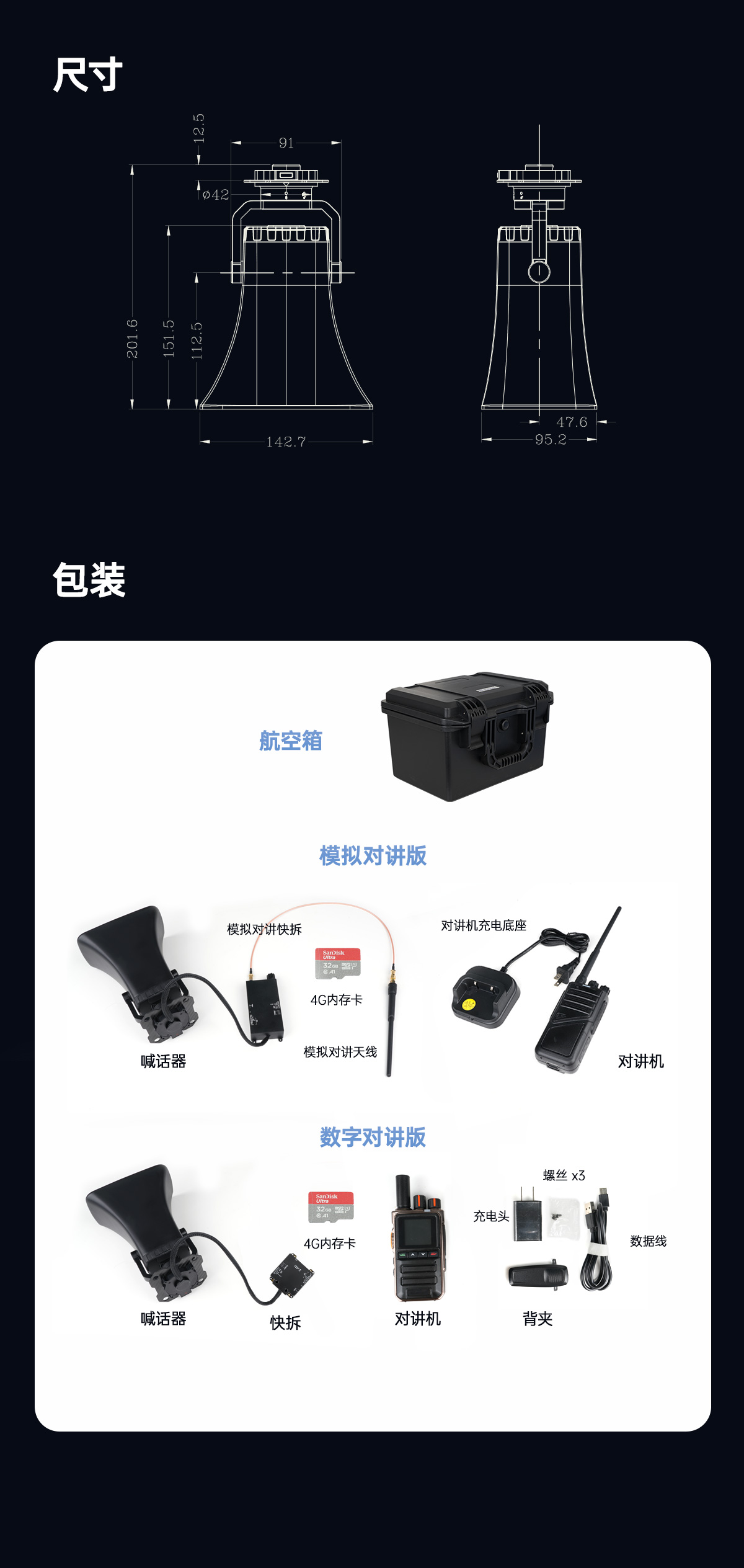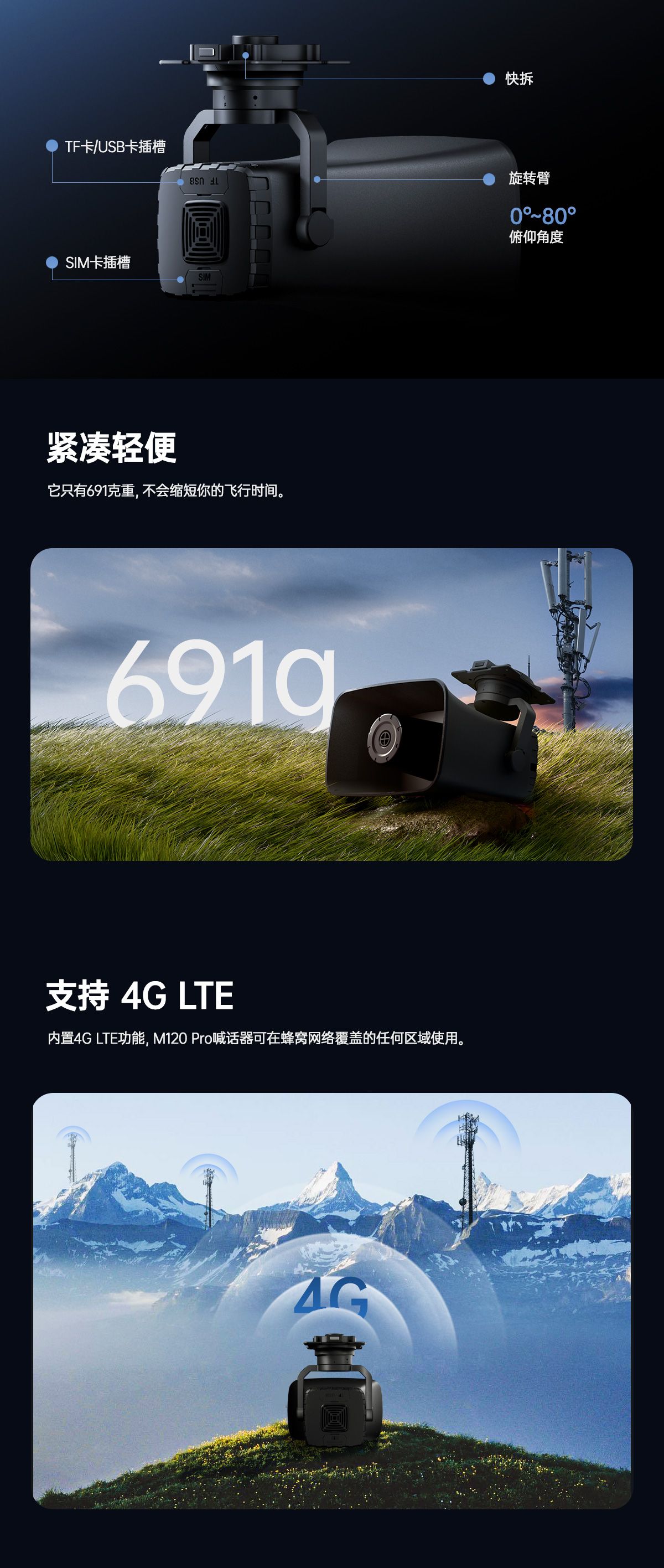 | 喊话器 | 功率 25W 最大声压 124dB@1m 有效广播距离 500m 指向性 80°x50 °(水平 x 垂直) 工作温度 -10°C~+40°C 负载接口 快拆 通信链路 LTE 4G网络链路 俯仰角度 0-80° | |||||
