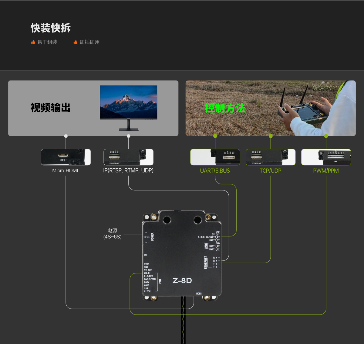 | 控制方式 | PWM / PPM / UART / S.BUS / TCP / UDP |