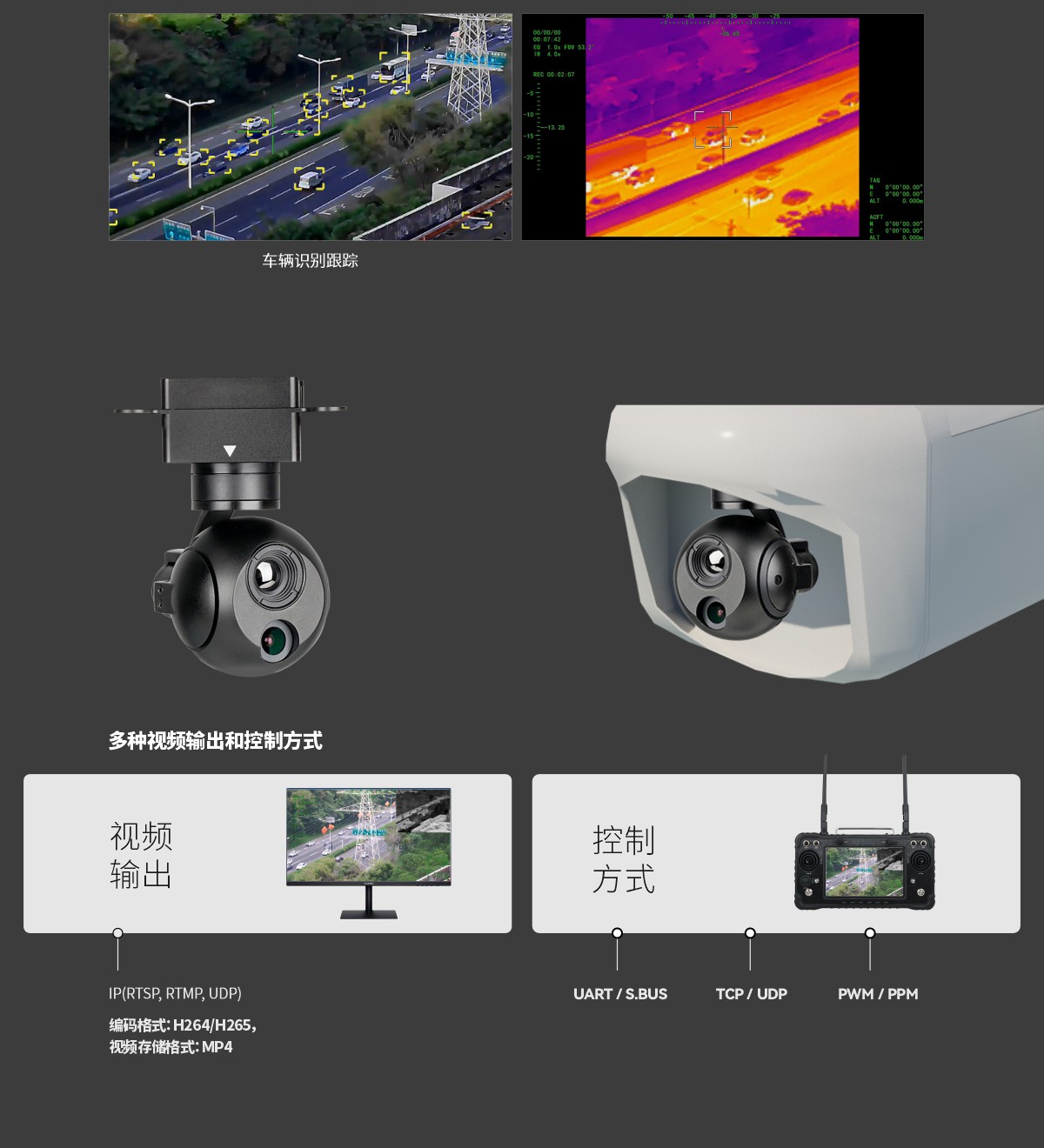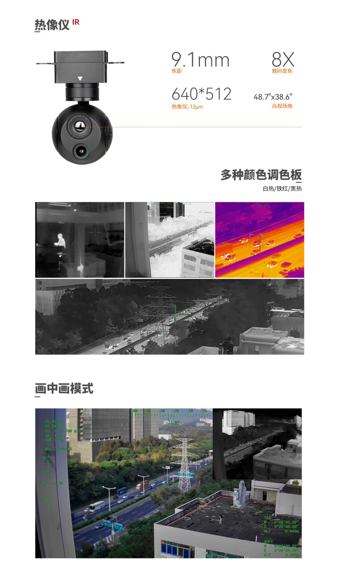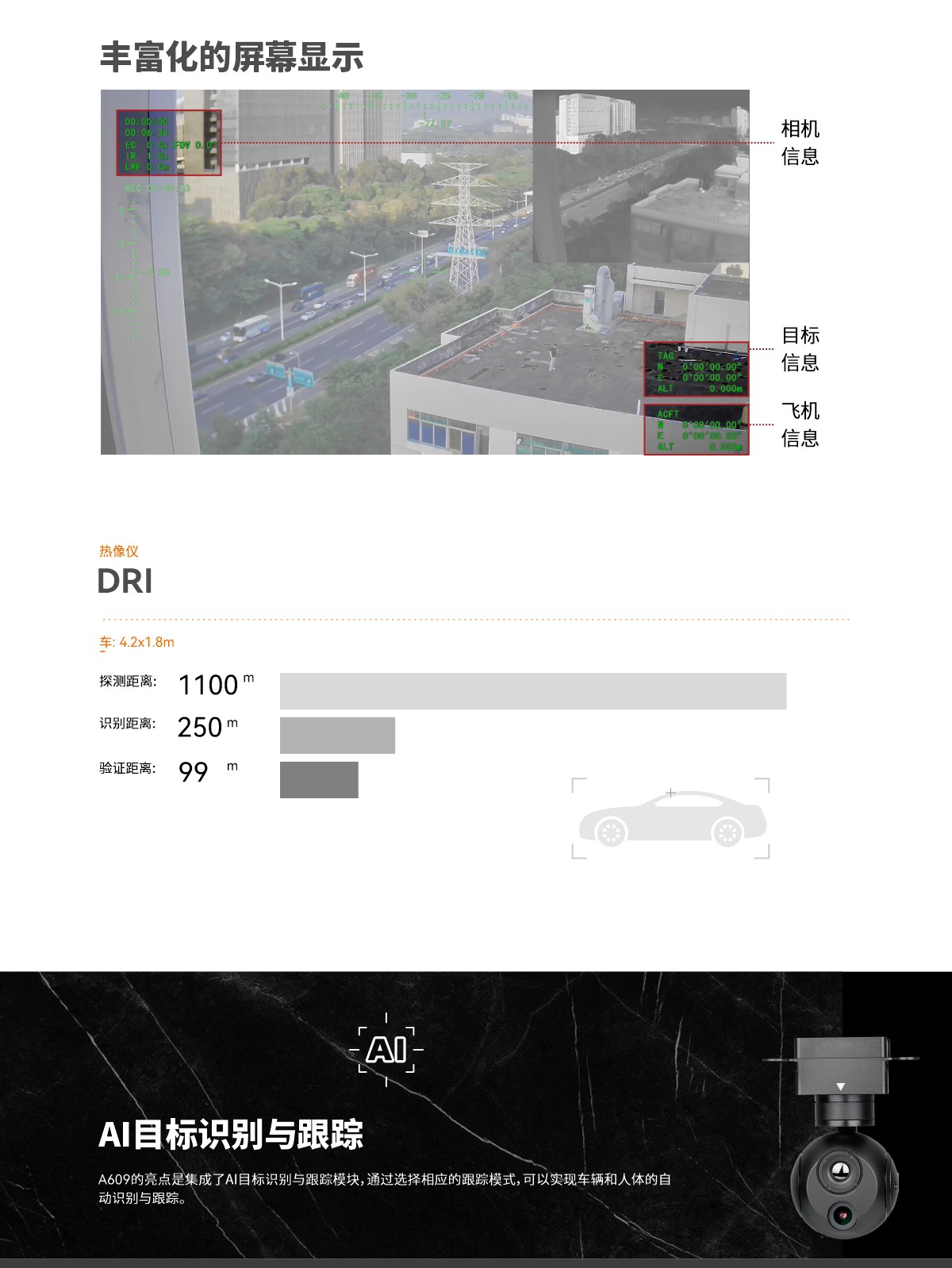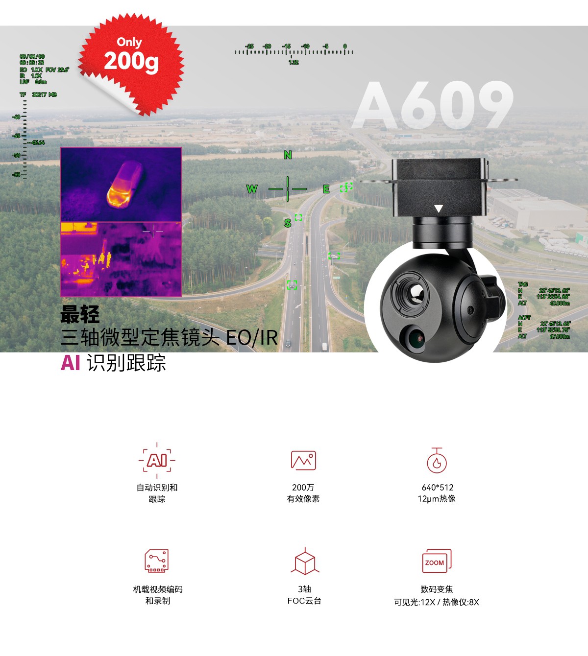 A609是一款高精度三轴增稳吊舱,配有200万像素的可见光定焦相机,9.1毫米非制冷氧化钒镜头640x512分辨率热成像仪。其支持拍照录像,目标跟踪功能,AI检测车辆、人员。