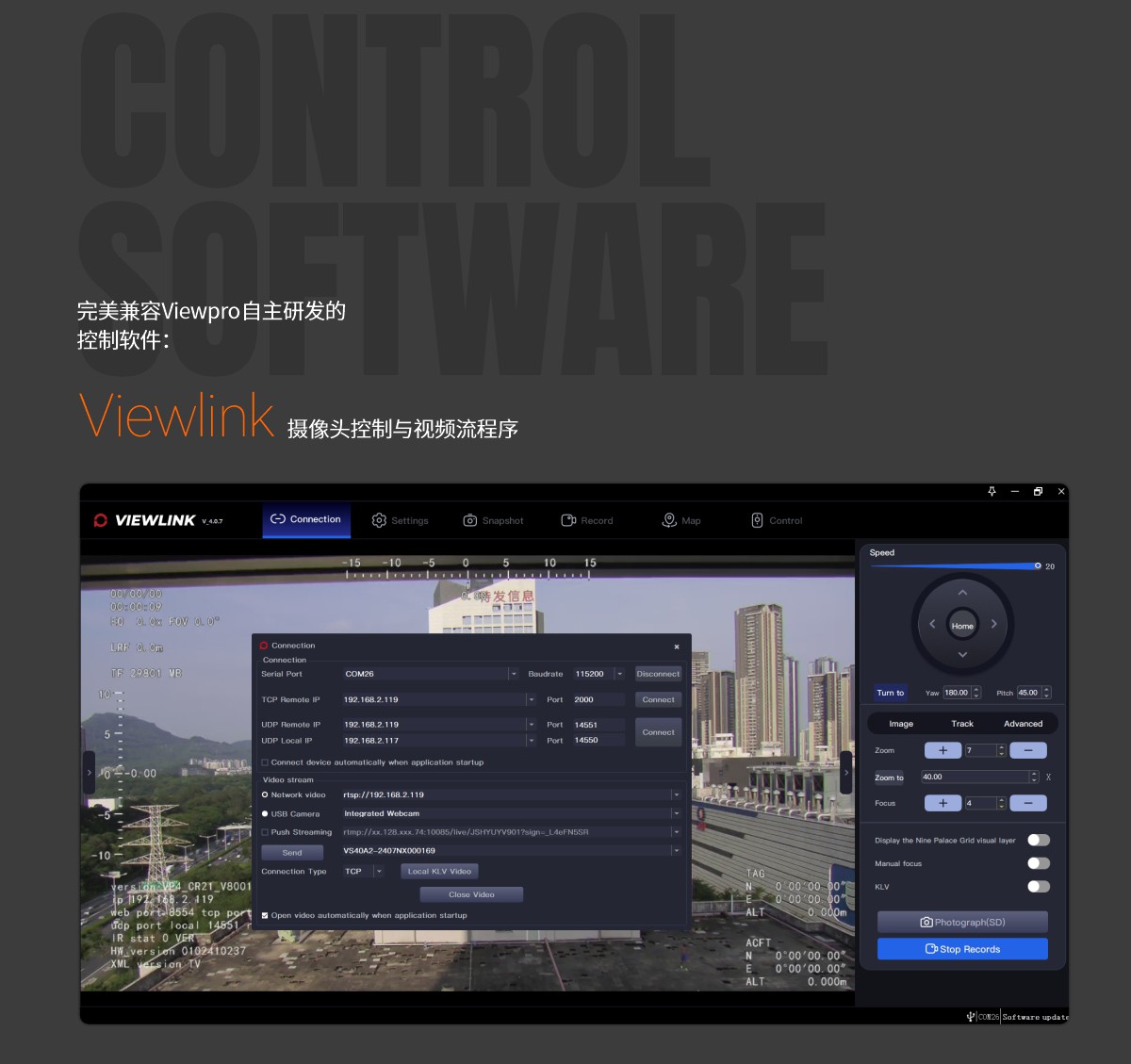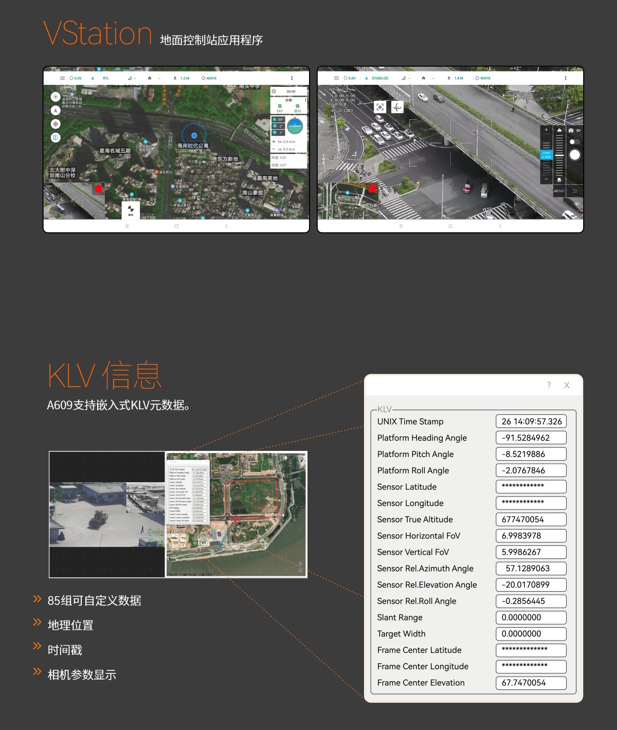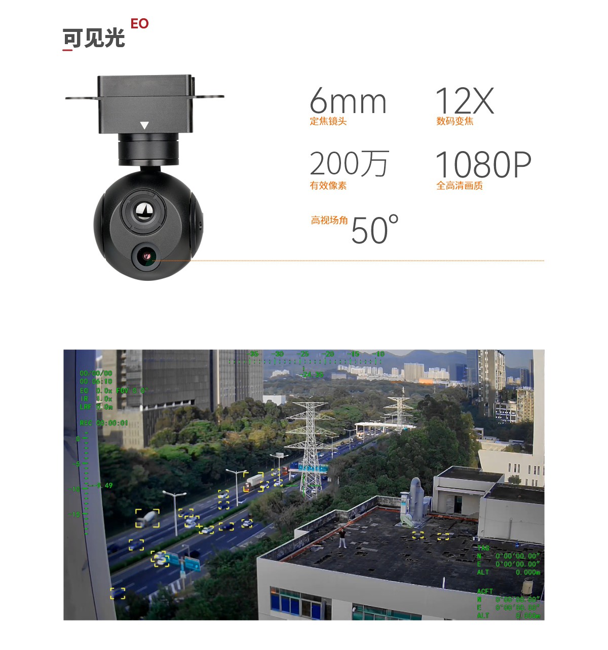 画面上OSD可显示云台航向俯仰角度、相机倍数及视场角,跟踪目标框,当外部有 GPS 及时间输入协议时,还能显示 GPS 经纬度及海拔高度信息及实时时间,支持OSD显示开与关;此时拍照,照片属性上带有拍摄时间与GPS信息。吊舱可以实现水平、横滚和俯仰三个方向增稳,采用减震与云台一体化设计,可大幅度减少机 械震动,能广泛用于公安、电力、消防、变焦航拍等行业应用中。