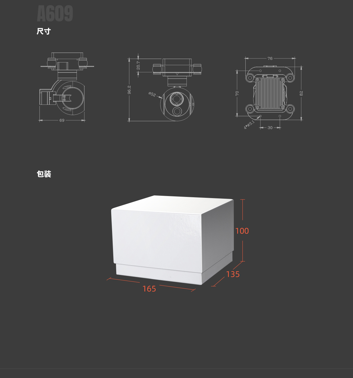 • A609 轻量级三轴微距定焦镜头EO/IR AI跟踪云台摄像头