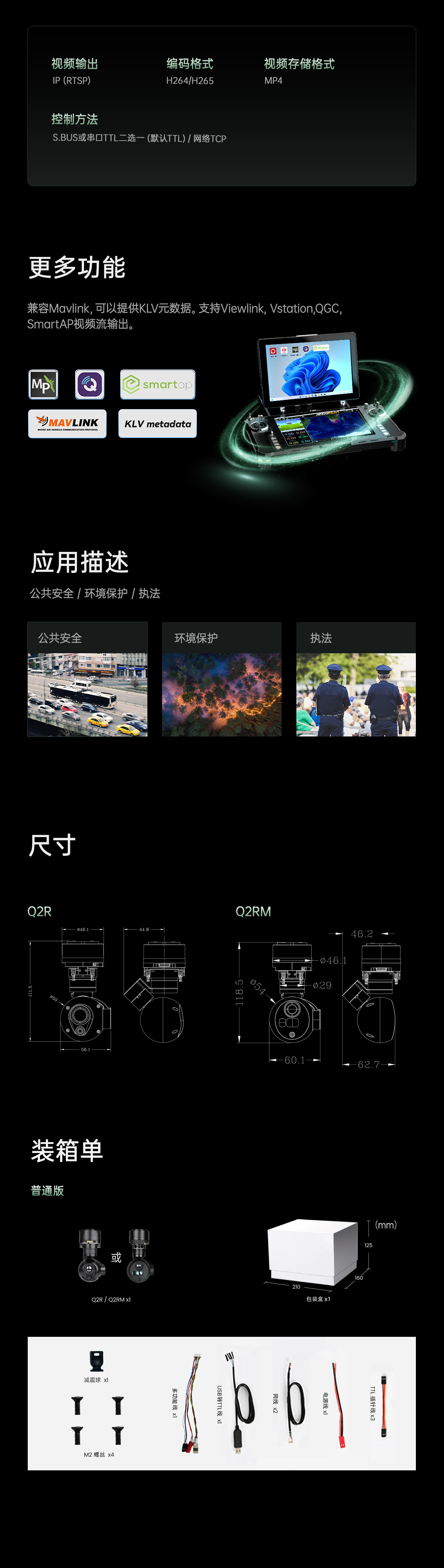 | ArduPilot / PX4 | 支持(Mavlink协议控制) 选配:支持ArduPilot Follow me功能 |