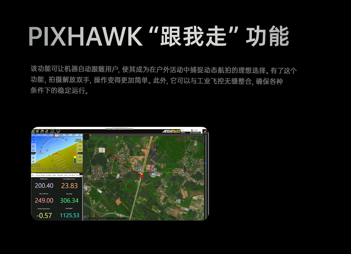 | ArduPilot / PX4 | 支持(Mavlink协议控制) 选配:支持ArduPilot Follow me功能 |